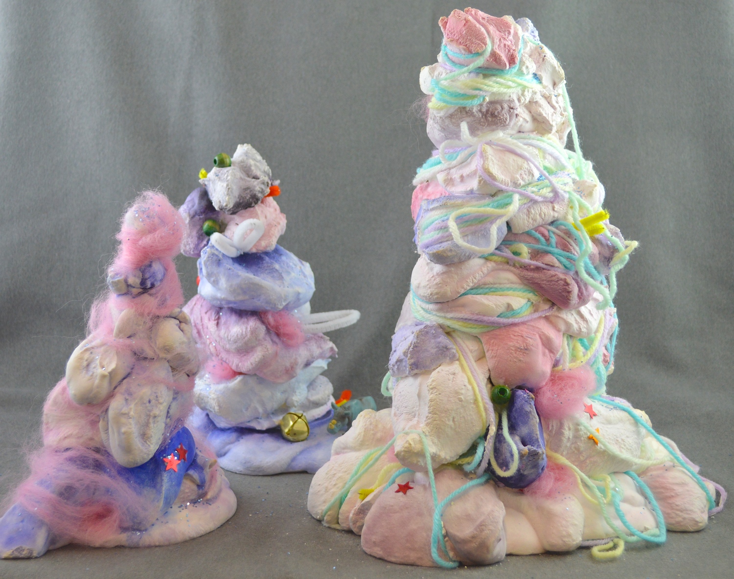 I took inspiration from my comforter on my bed in the making of this piece. I wanted to create a floppy, sleepy, and soft feeling, while using a hard and rough material like plaster. To evoke this airy and magical feeling I added in the pastel colors and glitter.